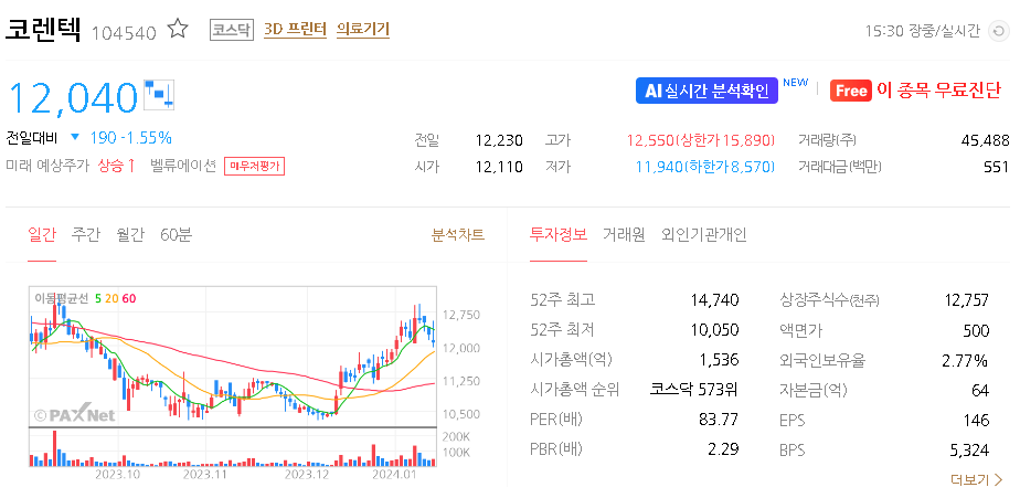 외국인 보유 비중은 2.75% 이며 장중 거래량은 45,414원 을 기록했습니다. 매출액은 620억 원을 달성했습니다. EPS는 없음원이며 코렌텍 주식 배당수익률은 % 입니다.