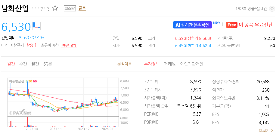 남화산업 현재 주가는 6,580원이며 전일 대비 -120원의 모습을 보이고 있습니다. 남화산업의 주주현황을 살펴보면 남화토건 주주가 전체 지분 84.76%를 소유하고 있습니다. 남화산업는 호텔 및 레저 기업으로 장중 기준으로 주가는 6,580원 입니다. 남화산업의 시가 총액은 1357억 원이며 발행 주식수는 20,588,000주 입니다.