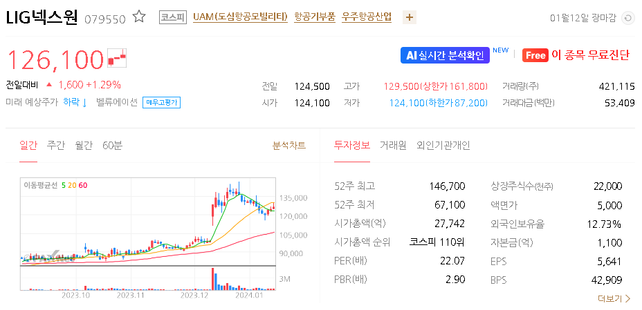 외국인 보유 비중은 12.73% 이며 장중 거래량은 332,269원 을 기록했습니다. 매출액은 16,285억 원을 달성했습니다. EPS는 7,188원이며 LIG넥스원 주식 배당수익률은 2.22% 입니다.