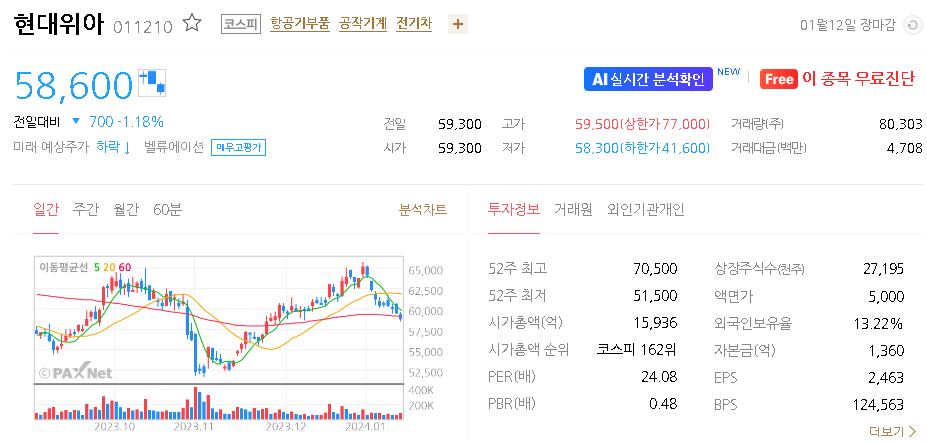 외국인 보유 비중은 13.22% 이며 장중 거래량은 54,319원 을 기록했습니다. 매출액은 64,791억 원을 달성했습니다. EPS는 3,458원이며 현대위아 주식 배당수익률은 1.42% 입니다.