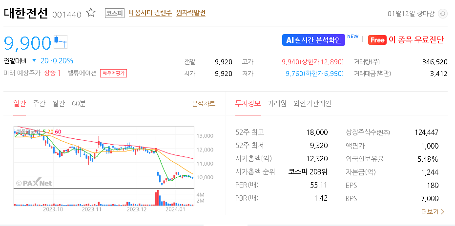 이 글에서는 대한전선 주가 전망과 목표 주가, 기업 정보에 대해서 설명합니다. 주식 거래에서 중요한 부분은 현재 기업 가치보다는 미래의 기업 가치를 예측하고 먼저 행동하는 것입니다. 투자할 종목을 고르기 전에 현재 기업의 상황과 지표를 살펴보는 것이 중요합니다. 대한전선 주식의 주요 현황과 투자 정보를 확인하시고 주식 투자에 도움을 줄 자료들을 모아 두었으니 투자에 도움을 받으시길 바랍니다.