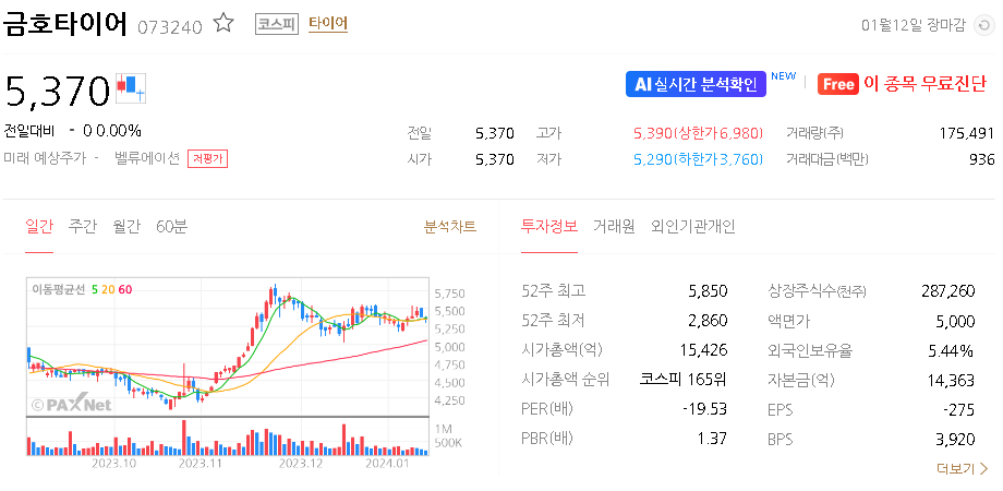 외국인 보유 비중은 5.44% 이며 장중 거래량은 220,557원 을 기록했습니다. 매출액은 29,805억 원을 달성했습니다. EPS는 401원이며 금호타이어 주식 배당수익률은 % 입니다.