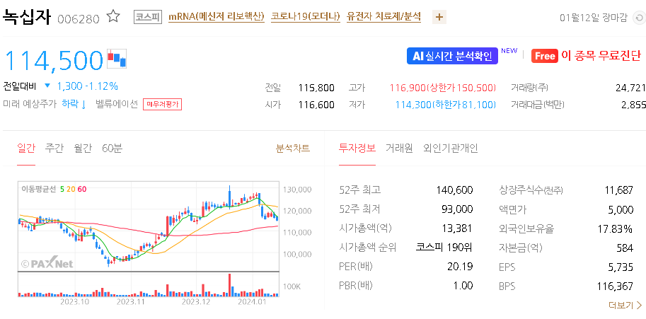 녹십자 현재 주가는 115,800원이며 전일 대비 -2,100원의 모습을 보이고 있습니다. 녹십자의 주주현황을 살펴보면 녹십자홀딩스 주주가 전체 지분 51.42%를 소유하고 있습니다. 녹십자는 제약 기업으로 장중 기준으로 주가는 115,800원 입니다. 녹십자의 시가 총액은 1조3381억 원이며 발행 주식수는 11,686,538주 입니다.