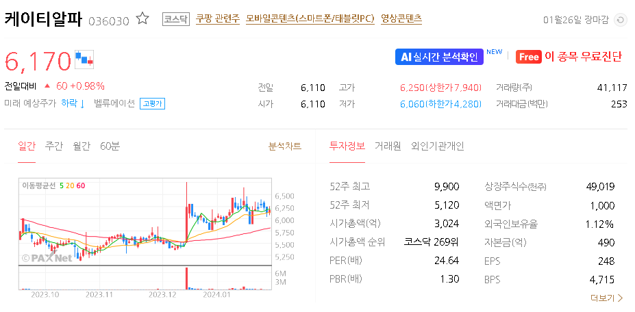 케이티알파 현재 주가는 6,110원이며 전일 대비 -100원의 모습을 보이고 있습니다. 케이티알파의 주주현황을 살펴보면 케이티 주주가 전체 지분 72.98%를 소유하고 있습니다. 케이티알파는 온라인쇼핑 기업으로 장중 기준으로 주가는 6,110원 입니다. 케이티알파의 시가 총액은 3024억 원이며 발행 주식수는 49,019,283주 입니다.